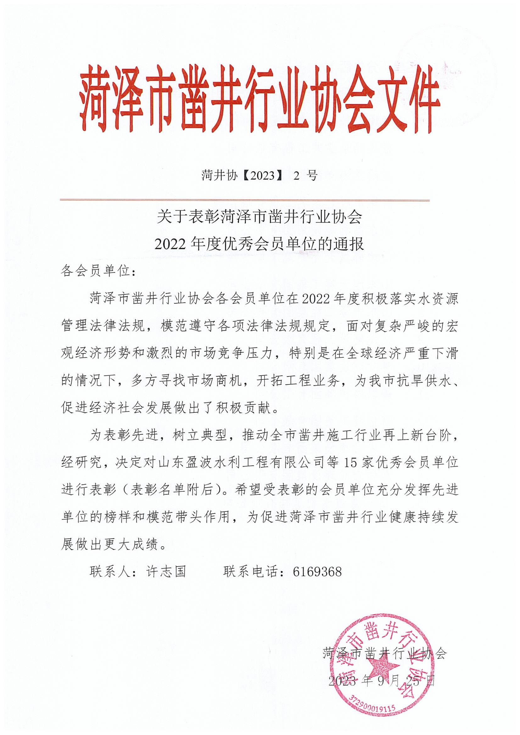 近日,根據(jù)菏澤市鑿井行業(yè)協(xié)會公布《關(guān)于表彰菏澤市鑿井行業(yè)協(xié)會2022年度優(yōu)秀會員單位的通報》的通知,山東中澤工程集團有限公司獲此殊榮。