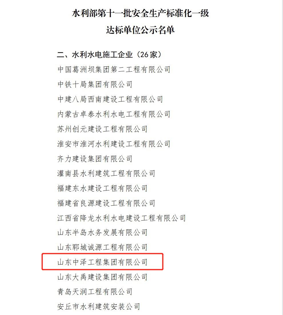 新年臨近,喜事連連。12月31日,國家水利部監(jiān)督司發(fā)布了水利部第十一批安全生產(chǎn)標(biāo)準(zhǔn)化達(dá)標(biāo)單位名單,其中,山東中澤工程集團(tuán)有限公司順利通過水利安全生產(chǎn)標(biāo)準(zhǔn)化評(píng)審委員會(huì)評(píng)審,榮升一級(jí)安全標(biāo)準(zhǔn)化企業(yè),向著成為現(xiàn)代化大型施工企業(yè)又邁出了一大步。